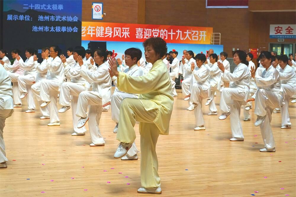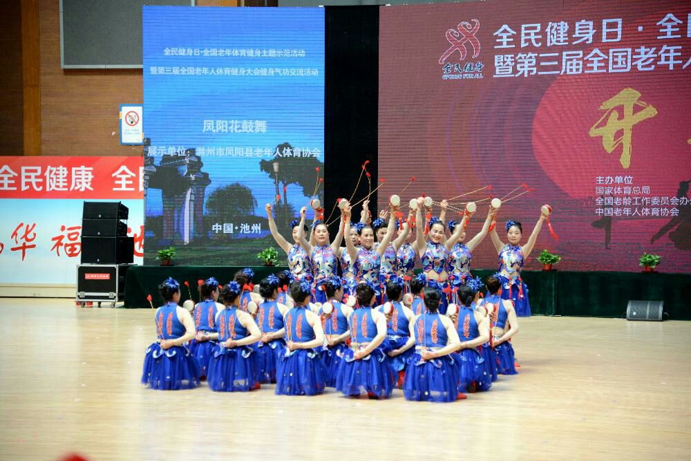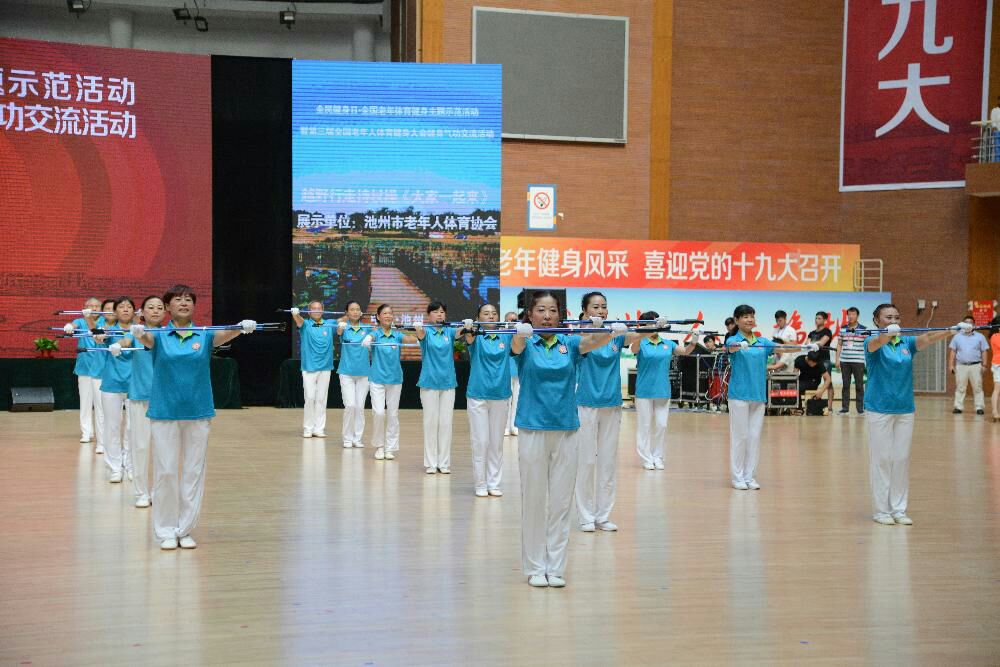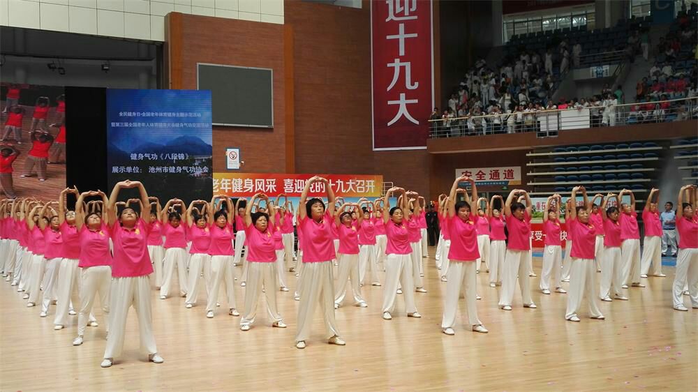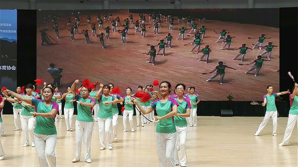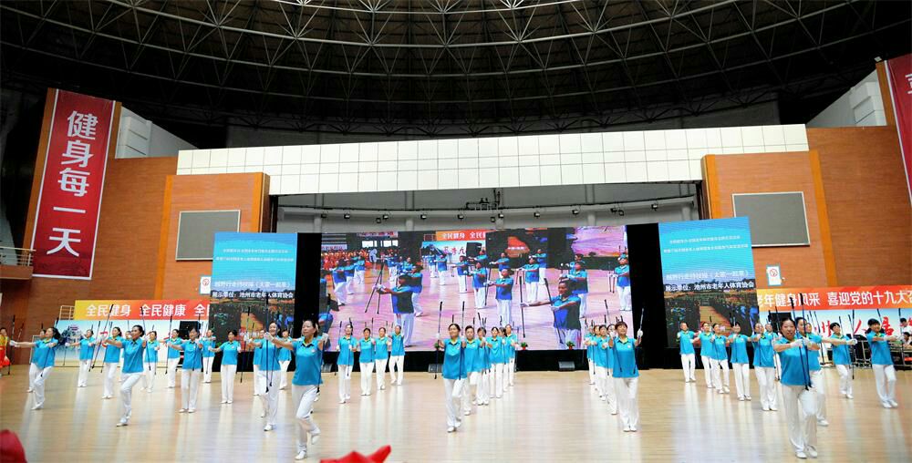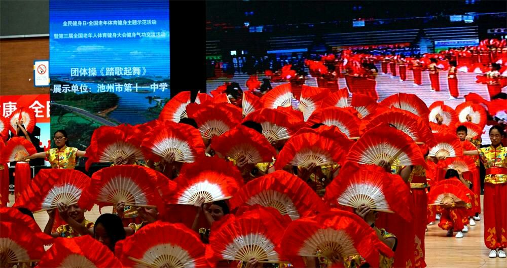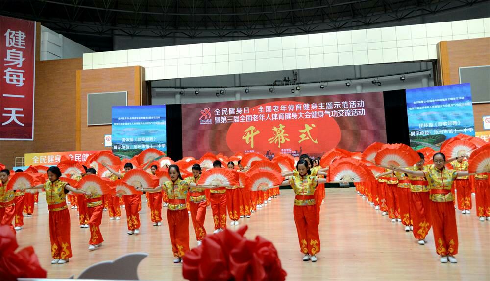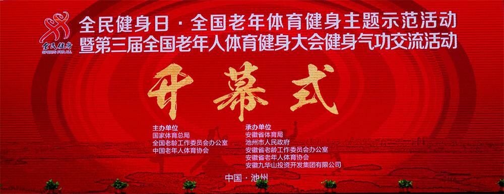 会民健身日.全国老年体育健身主题示范活动暨第三届全国老年人体育健身大会健身气功交流活动开幕式于8月7日在安徽池州市举行。本次活动由国家体育总局、全国老龄工作委员会办公室和中国老年人体育协会主办,安徽省体育局、池州市人民政府、安徽省老龄工作委员会办公室、安徽省老年人体育协会和安徽九华山投资开发集团有限公司承办。来自全国各省、市、计划单列市、行业代表团的2000余名老年朋友相聚池州。山东省代表团在中国老体协副主席、省老体协主席曹学成带领下,参加了此次活动。