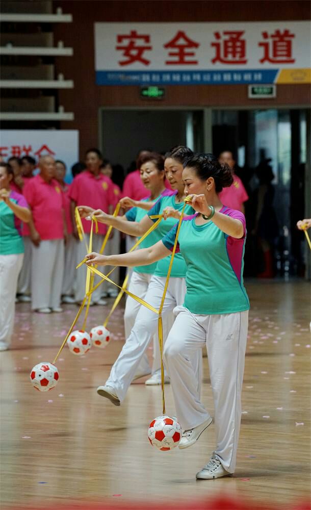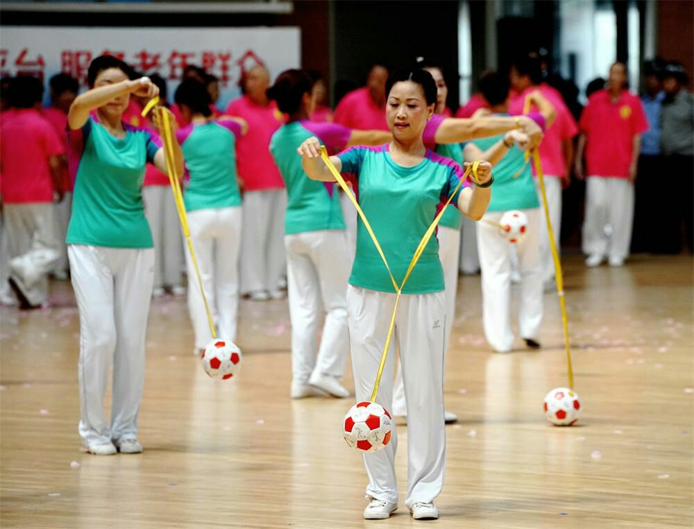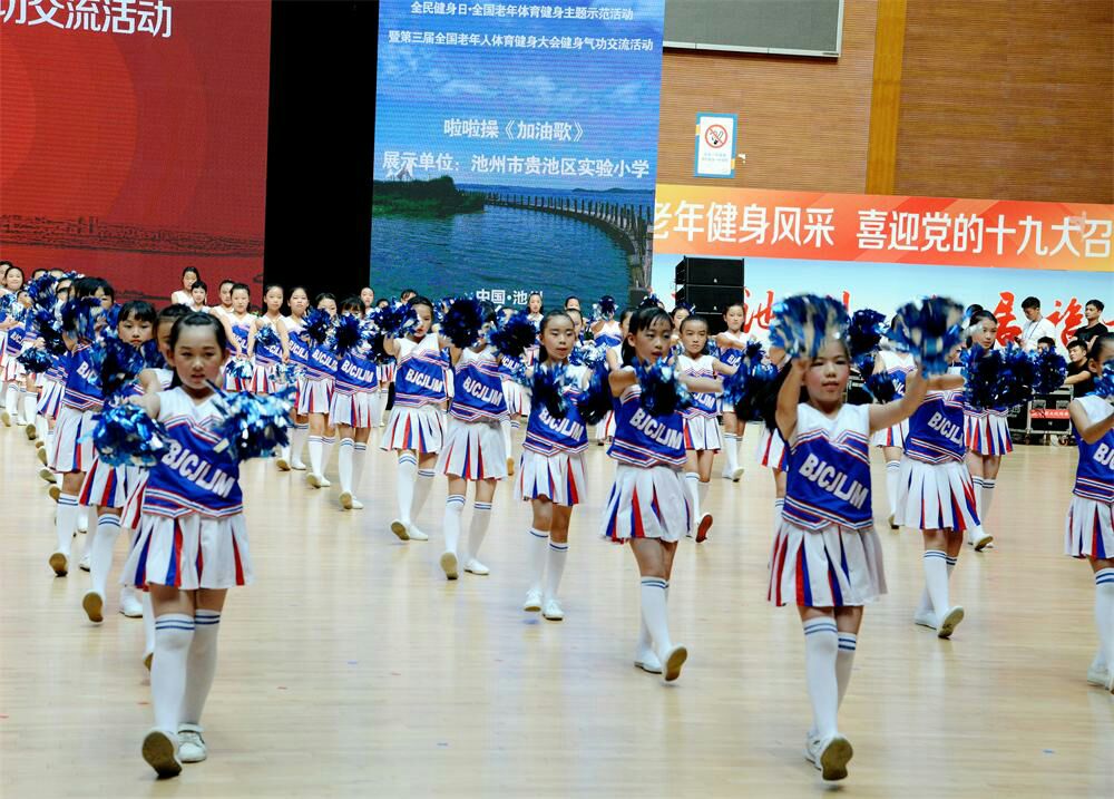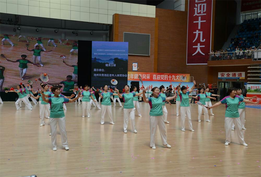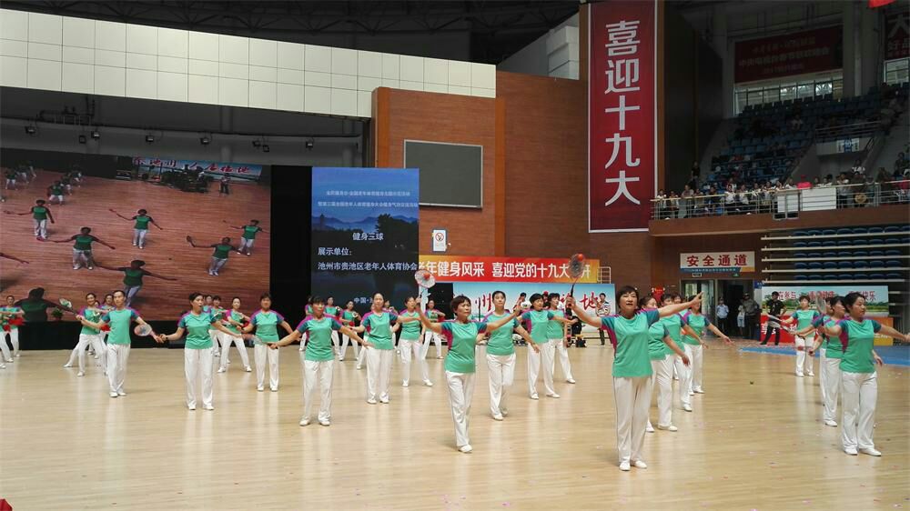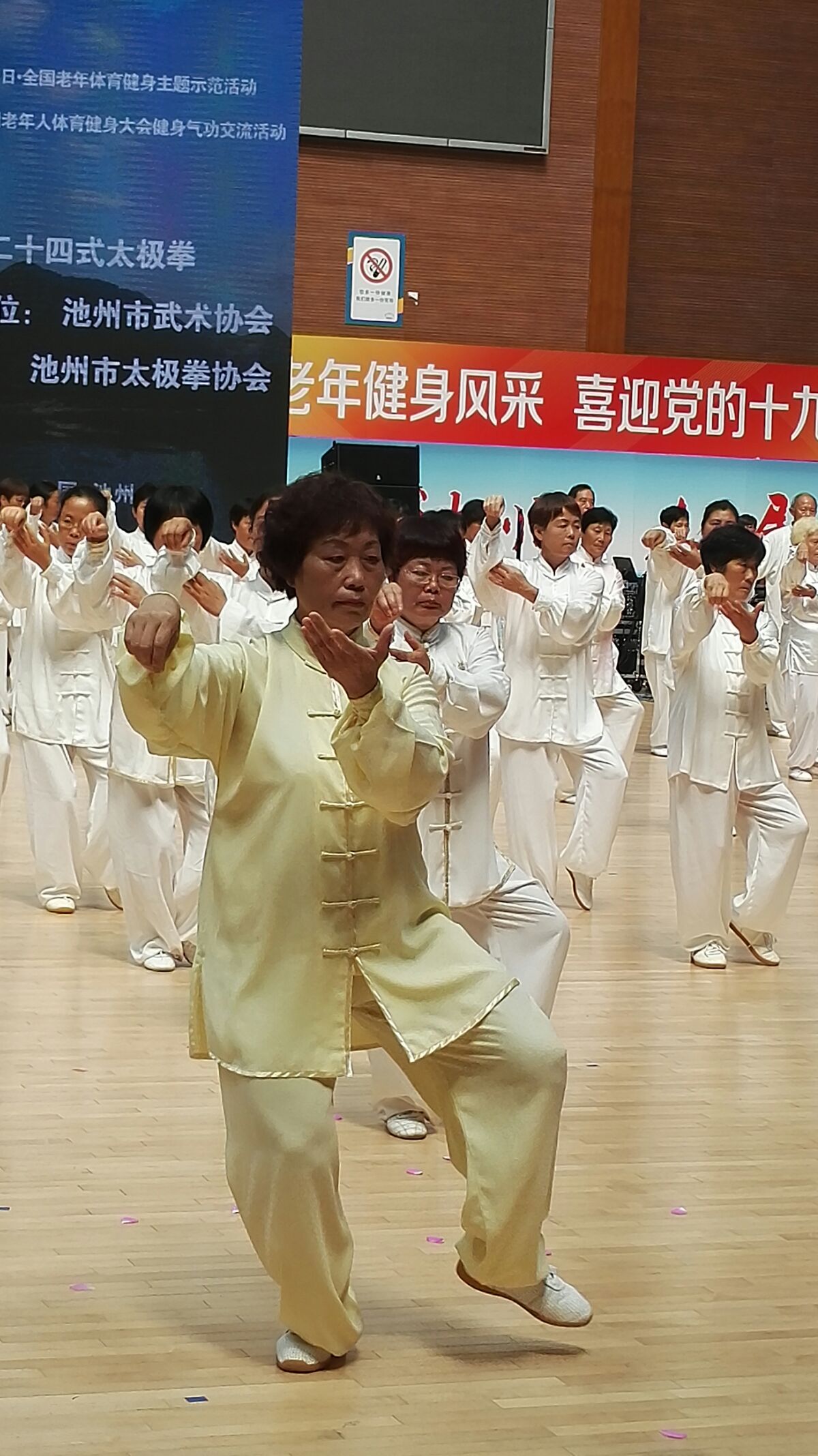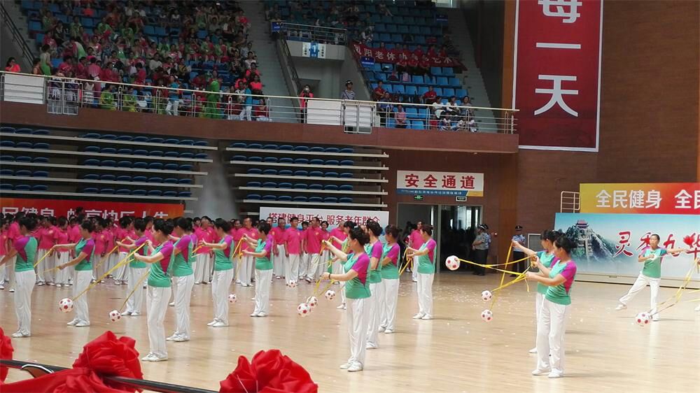 会民健身日.全国老年体育健身主题示范活动暨第三届全国老年人体育健身大会健身气功交流活动开幕式于8月7日在安徽池州市举行。本次活动由国家体育总局、全国老龄工作委员会办公室和中国老年人体育协会主办,安徽省体育局、池州市人民政府、安徽省老龄工作委员会办公室、安徽省老年人体育协会和安徽九华山投资开发集团有限公司承办。来自全国各省、市、计划单列市、行业代表团的2000余名老年朋友相聚池州。山东省代表团在中国老体协副主席、省老体协主席曹学成带领下,参加了此次活动。